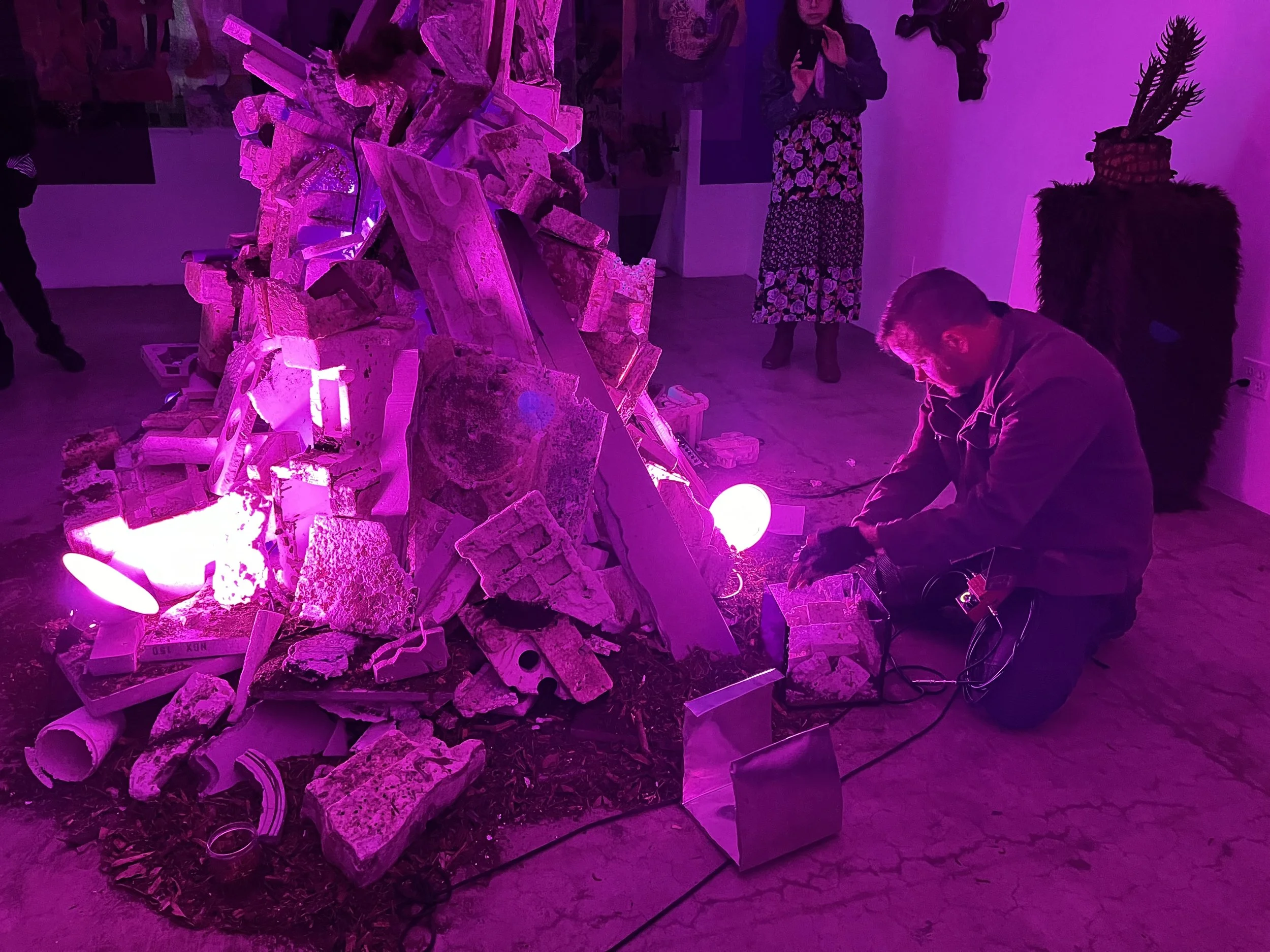 A stacked Pyre of partially-metabolized styrofoam rubble populates the gallery floor, like the towers of wood that were once assembled to “test” the godliness of those accused of witchcraft and other heresies. But there are no witches here to burn, only carbon trapped in a toxic industrialized form, waiting to be released into its fluidity. Spotlit from below with pink and blue grow lights like karaoke superstars or prize fruit trees from a speculative postnatural food forest, this Pyre stands on a stage of loose, post-plastic earth, gathered from local sites with a history petroleum extraction and military occupation. Poisoned yet fertile, this dirty ground holds both the toxic traces of petro-colonial exploitation and the nutrient-rich possibilities of plastic transformed into nitrogen and calcium-rich fertilizer by this trans ecosystem of shapeshifting creatures.