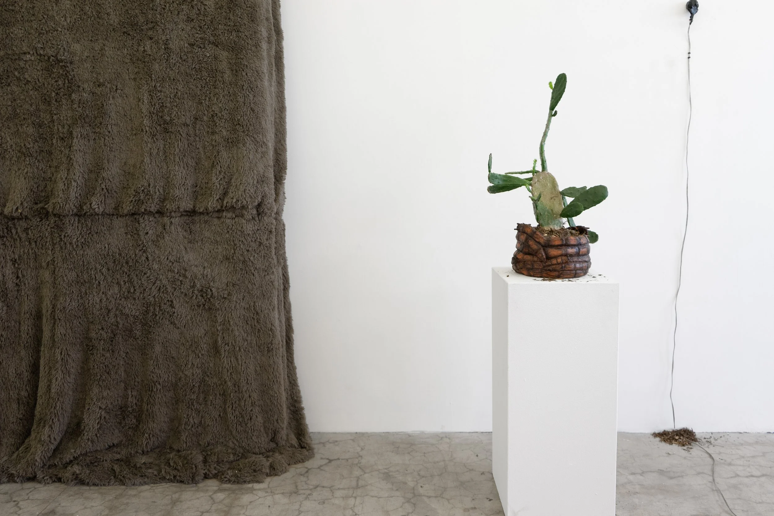 Mealworm-shaped Swarm Pots collect and hold this damaged, yet vibrant, earth, in handbuilt vessels around the gallery, raising it up like an imperfect offering of trans/more-than-human care for the castoff fragments of parking lot cacti that now grow inside them.
