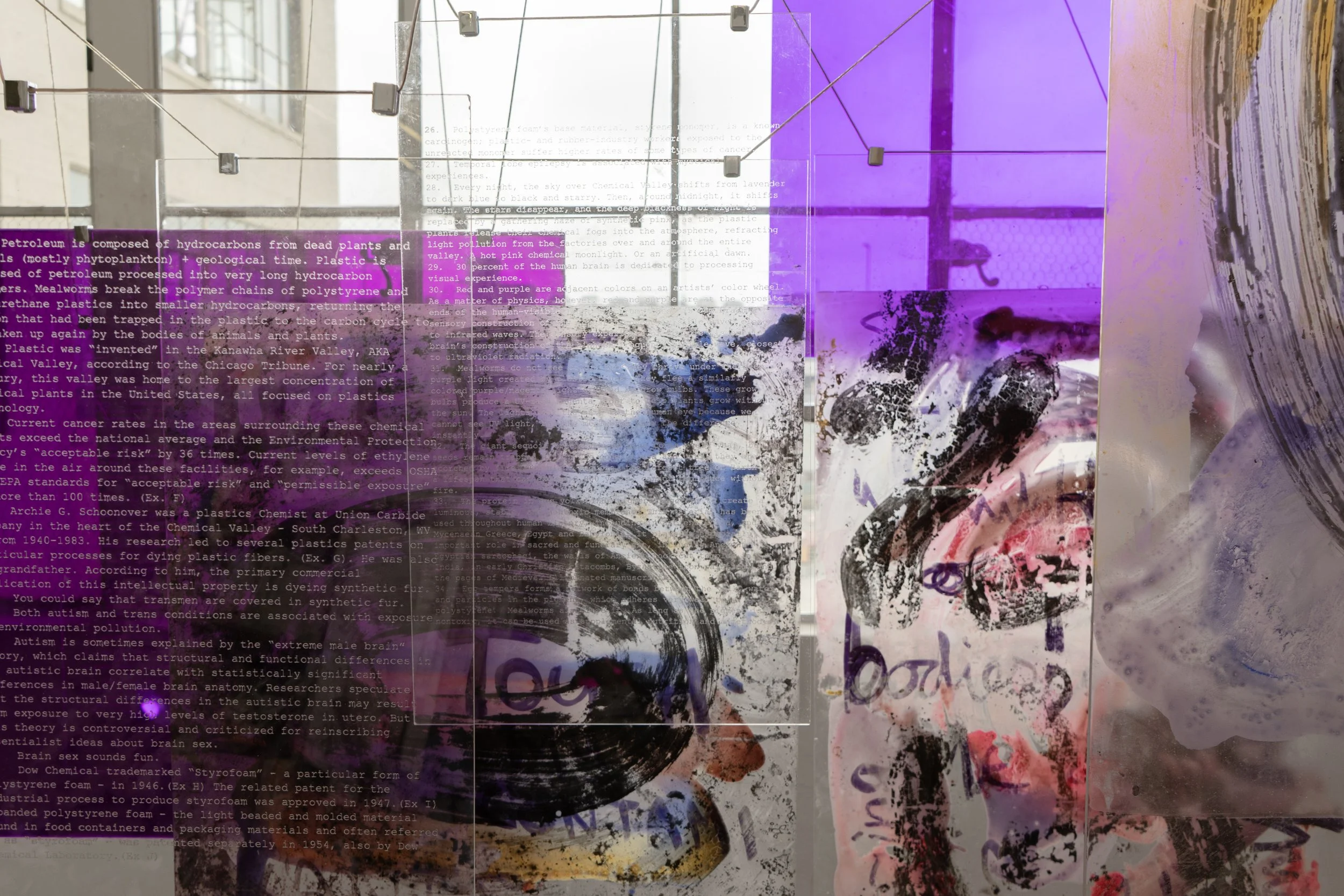 Looking Glass - a suspended collage of overlapping translucent plastic inscribed with poetic “facts,” semi-translucent pools of pollution-consuming mycorrhizal fungal egg tempera, lacy prints of partially-metabolized styrofoam, and more-than-human language - hangs in space between the main gallery and its large composite window. Looking Glass intervenes in space and disrupts the unmarked gaze, transforming the view of Los Angeles through the gallery’s large window into a kaleidoscopic cityscape of purple, text, and more-than-human gesture, like a portal to a different outside world. Composed of reflective materials that also cast color and shadow into the gallery space, Looking Glass acts on the observer as much as it acts on the observed, requiring viewers to accept the possibility of being written and marked upon by these plastic bodies as a precondition of looking at and through them.